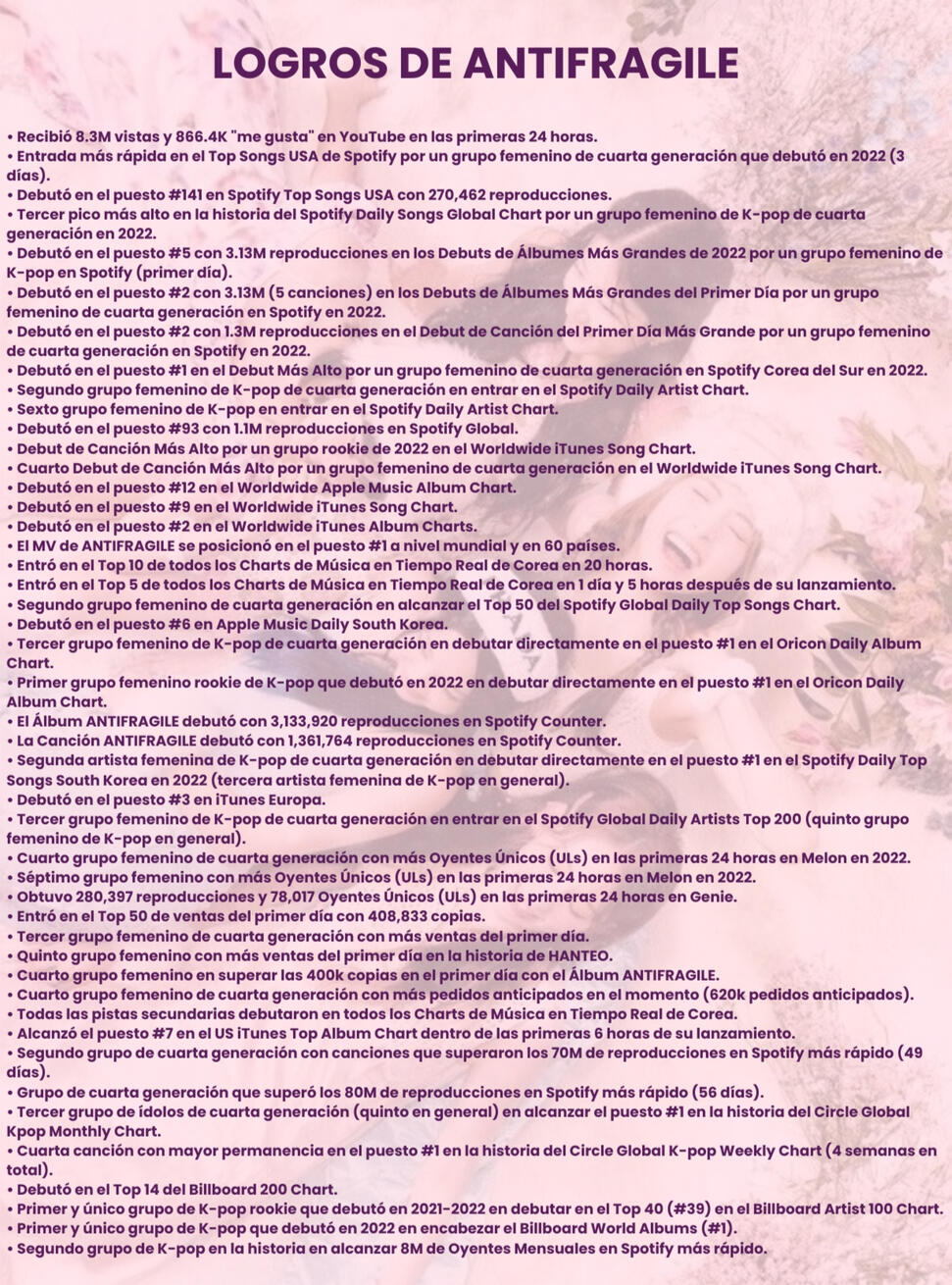 - El grupo no tendría líder, pero la empresa terminó sugiriendo que fuera Chaewon y ella aceptó.- El concepto del grupo se basó en la vida y trayectoria de cada uno de los integrantes, para lo cual se sostuvieron entrevistas y conversaciones con ellos.- Chaewon fue la primera integrante elegida para el grupo y luego Sakura.- Yunjin fue la tercera integrante elegida, ya no era trainee y estaba en Estados Unidos cuando recibió la llamada para unirse al grupo.- Kazuha fue reclutada por el propio CEO de Source, quien fue a Países Bajos para llamarla al grupo.- Eunchae fue la última en ser reclutada, a pesar de ser aprendiz de Source desde 2021, solo fue elegida como miembro de LE SSERAFIM 3 meses antes del debut.